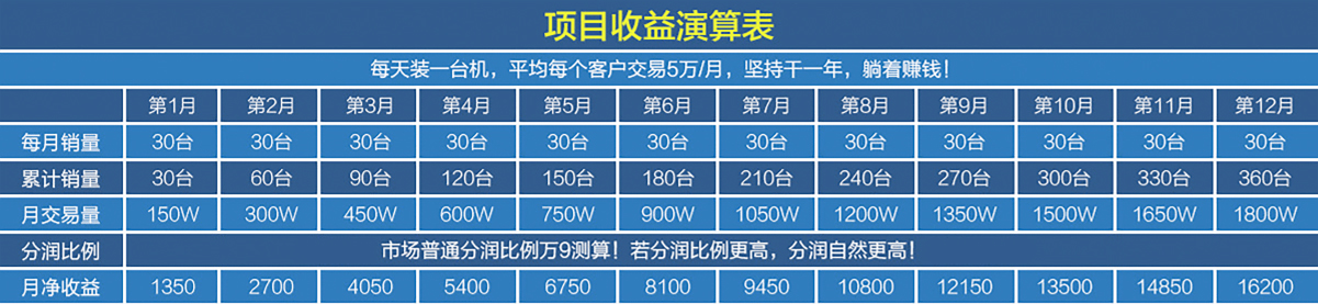 第3月装30台,共90台,每月交易量450W,则每月4050元收入。12个月后,共360台,每月交易量1800W,收入16200元。